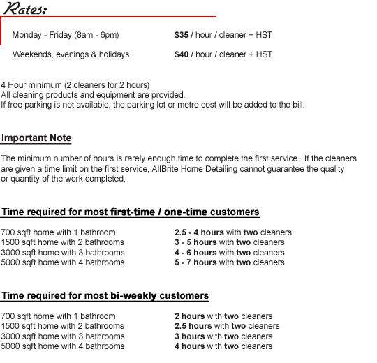 AllBrite Home Detailing is the perfect service for those who will settle for nothing but the best and are willing to pay a little extra to get it. The hourly rates are both fair and competitive. However, we specialize in detailed cleaning and as a result, we require more time than other home cleaning services.